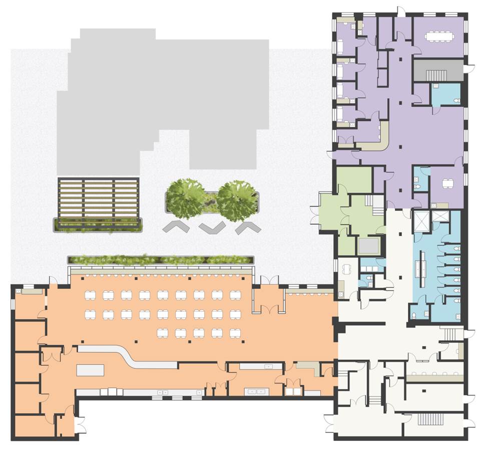 Build central courtyard that connects all spaces on site