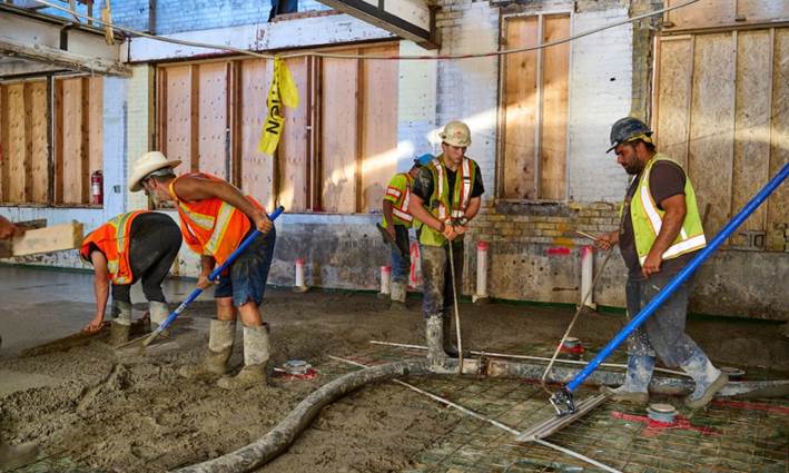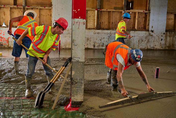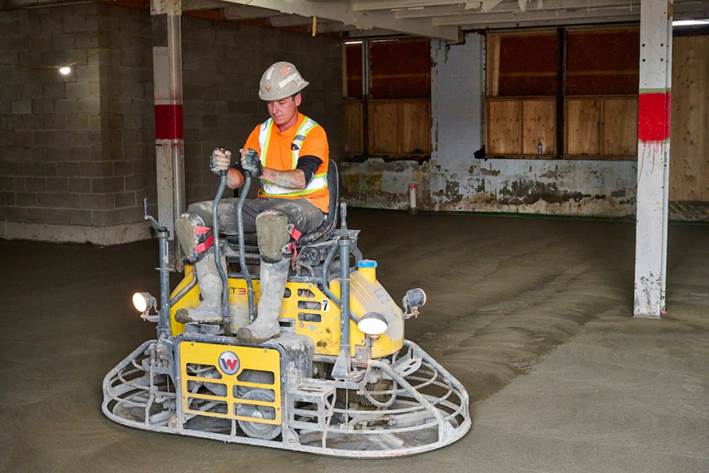 Construction workers pour and finish the main concrete floor comprising 7500 sq. ft.