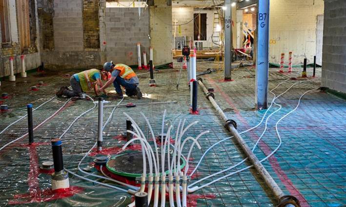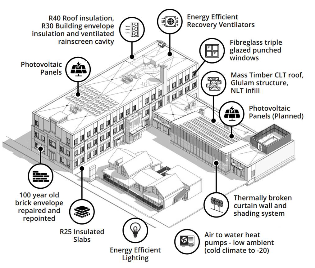 It was important to achieve several design goals in creating a sustainable building within an adaptive re-use project. This included minimizing the use of fossil fuels for a very high density and compact occupancy.